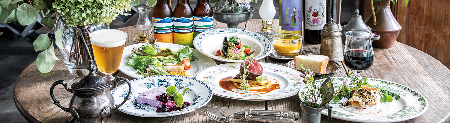 花とアンティークに囲まれた素敵空間で、 都城産宮崎牛と地元野菜のフルコースが味わえる。