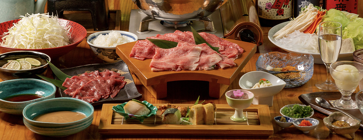 季節に合わせた前菜とお店自慢の割下で 堪能する都城産宮崎牛のすき焼き会席と 厳選された部位を特製の出汁にくぐらせて召し上がる しゃぶしゃぶしゃぶ会席の2つのコースご用意。